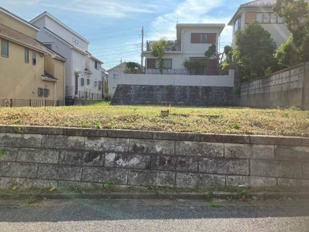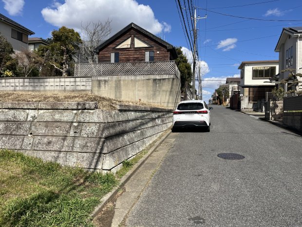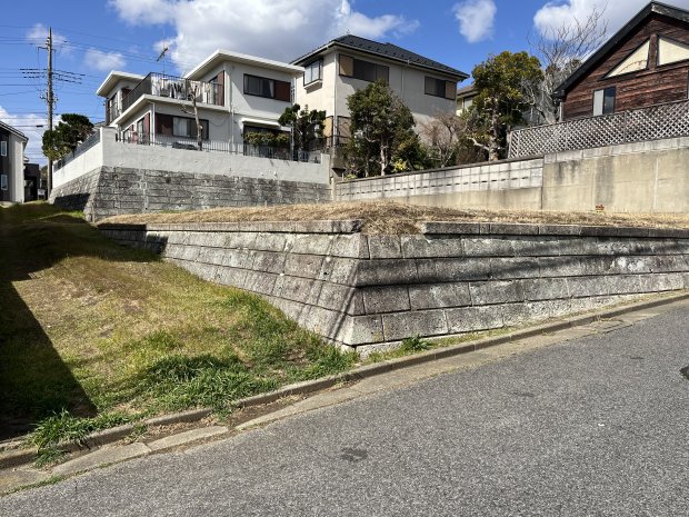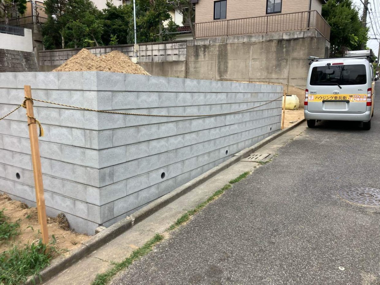 この写真の土地の場合は、前面道路と比べると高台となっているため高低差を解消する必要があります。擁壁(土砂が崩れるのを防ぐために設置された壁)を解体し、土を削り地面を整え、新たにコンクリートブロックで土砂が流れ出ないように土留め施工を行いました。