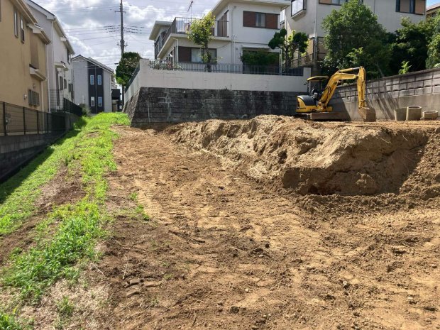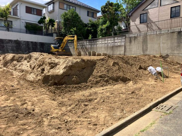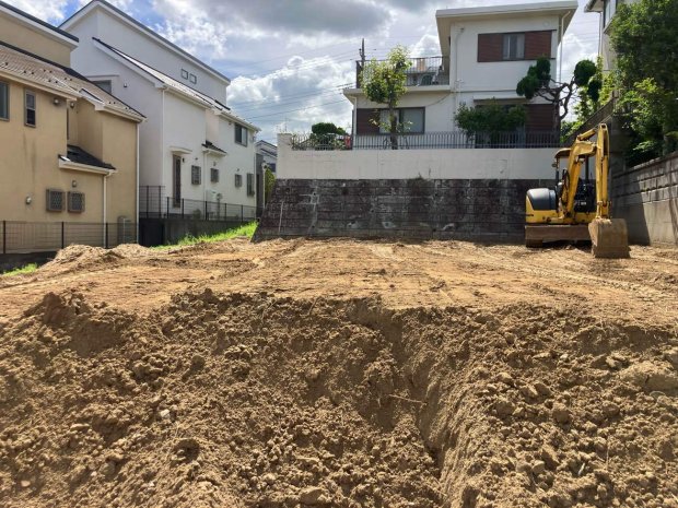 新築では、このままの状態だと戸建の建築が難しい土地があります。その場合、建物を建てる前に土地を整えるための工事が必要です。これが『先行造成工事(一期工事)』と言います。