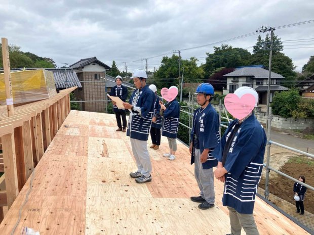 屋根の上で棟梁が棟締を行い、祝詞を読んで工事の無事完成を祈りました。