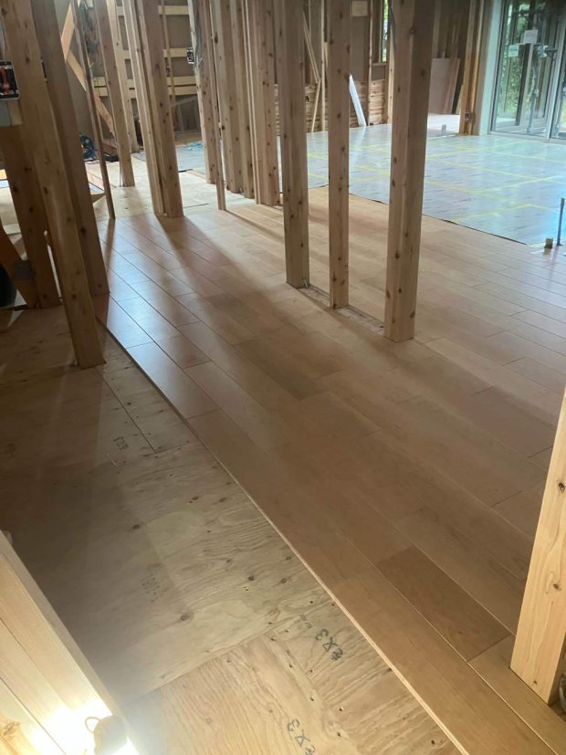 現在はブラックチェリーの挽き板のフローリングを施工し、