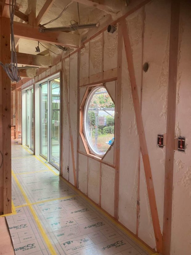 現在は下地の工事を棟梁が進めています。丸窓も良い感じです。