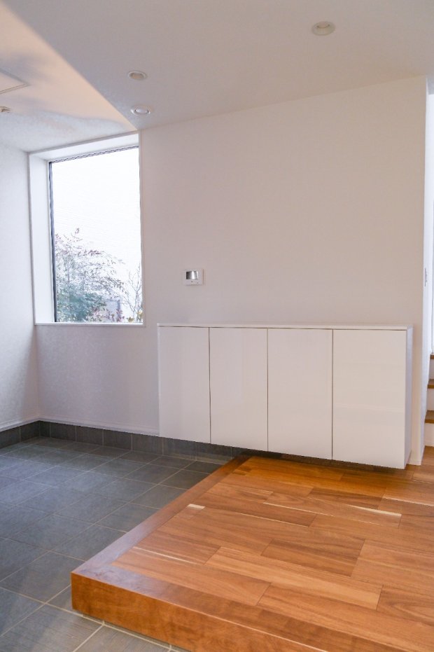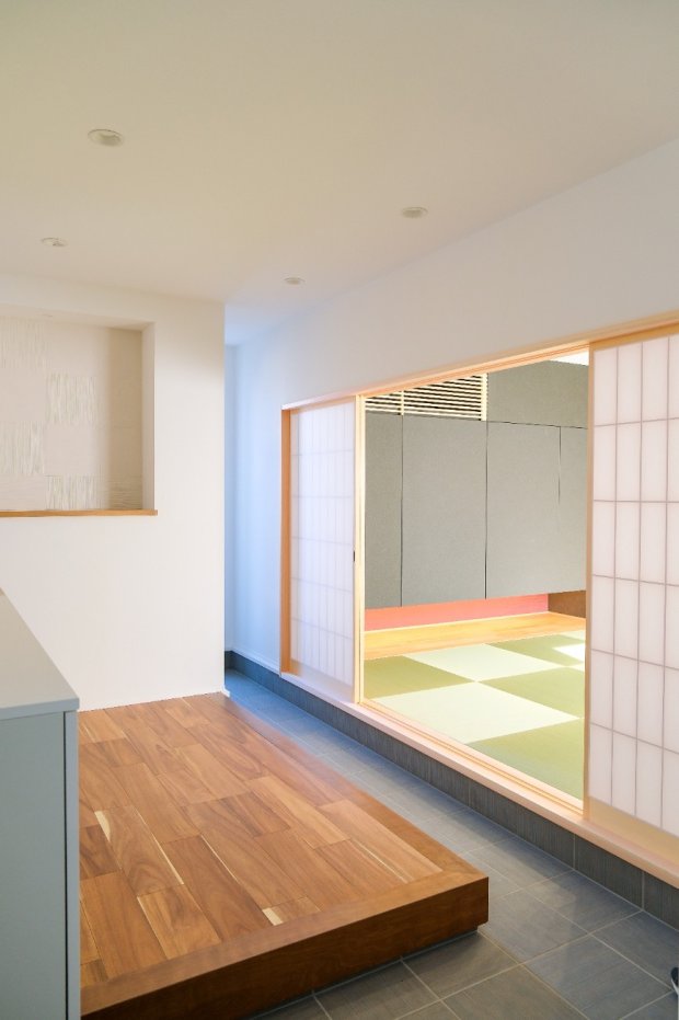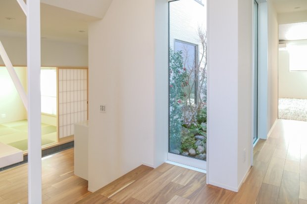玄関入って正面には中庭が見える窓があり、土間を通って和室になります。造作収納をアクセントに琉球畳も映えるとても素敵な玄関周りになっています。