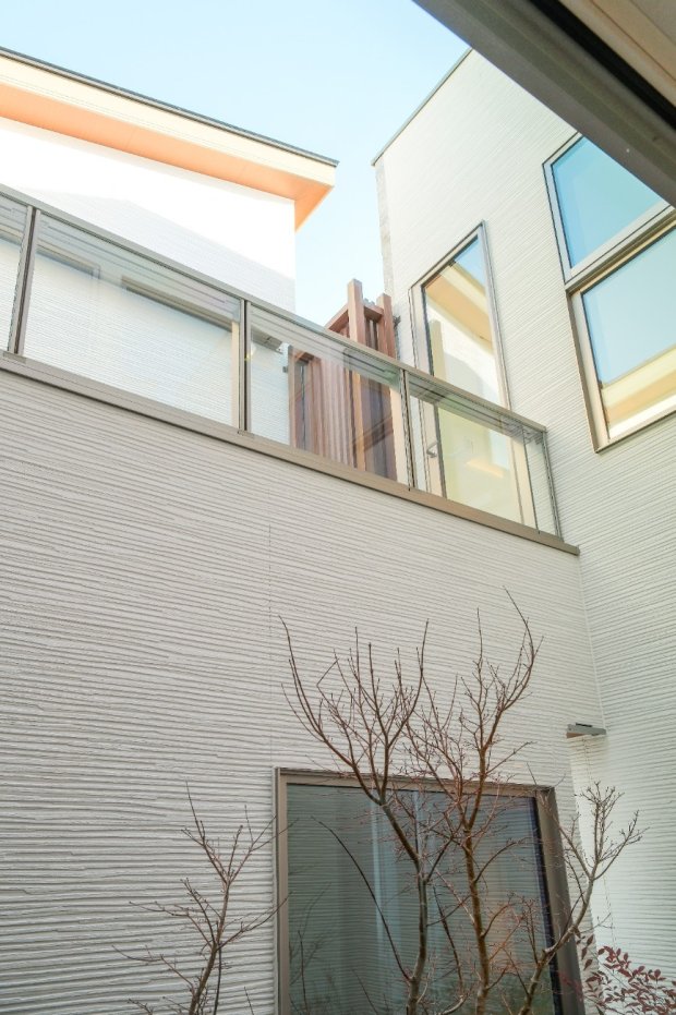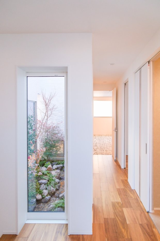 スキップ階段を上がると、廊下からは中庭が見えます。水が流れる音が心地よく、見上げると空も見えてとても落ち着きます。