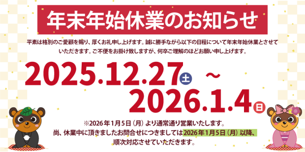 年末年始休業期間:2025年12月27日(土)~2026年1月4日(日)
