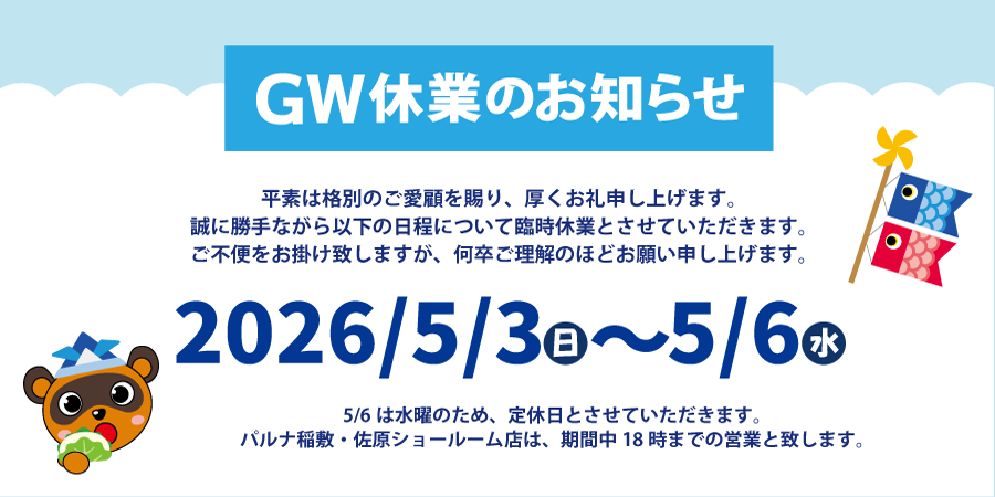 パルナ稲敷・佐原ショールーム店は、期間中18時までの営業と致します。